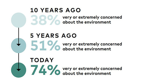 The growing environmental awareness of the business world is, in part, driven by changing attitudes among the population at large. Companies, after all, are made up of people, and people throughout American society are beginning to look for ways to help preserve our natural environment and stave off a global ecological and climate crisis. In fact, according to a 2019 Consumer Brands Association report, 74% of adults are concerned about the environment in the United States. Among millennials that percentage rises to 82%.
