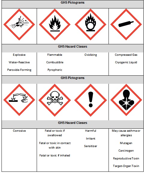 - GHS hazard pictograms: These communicate physical, environmental, and health hazard information, and are assigned a hazard class and category.